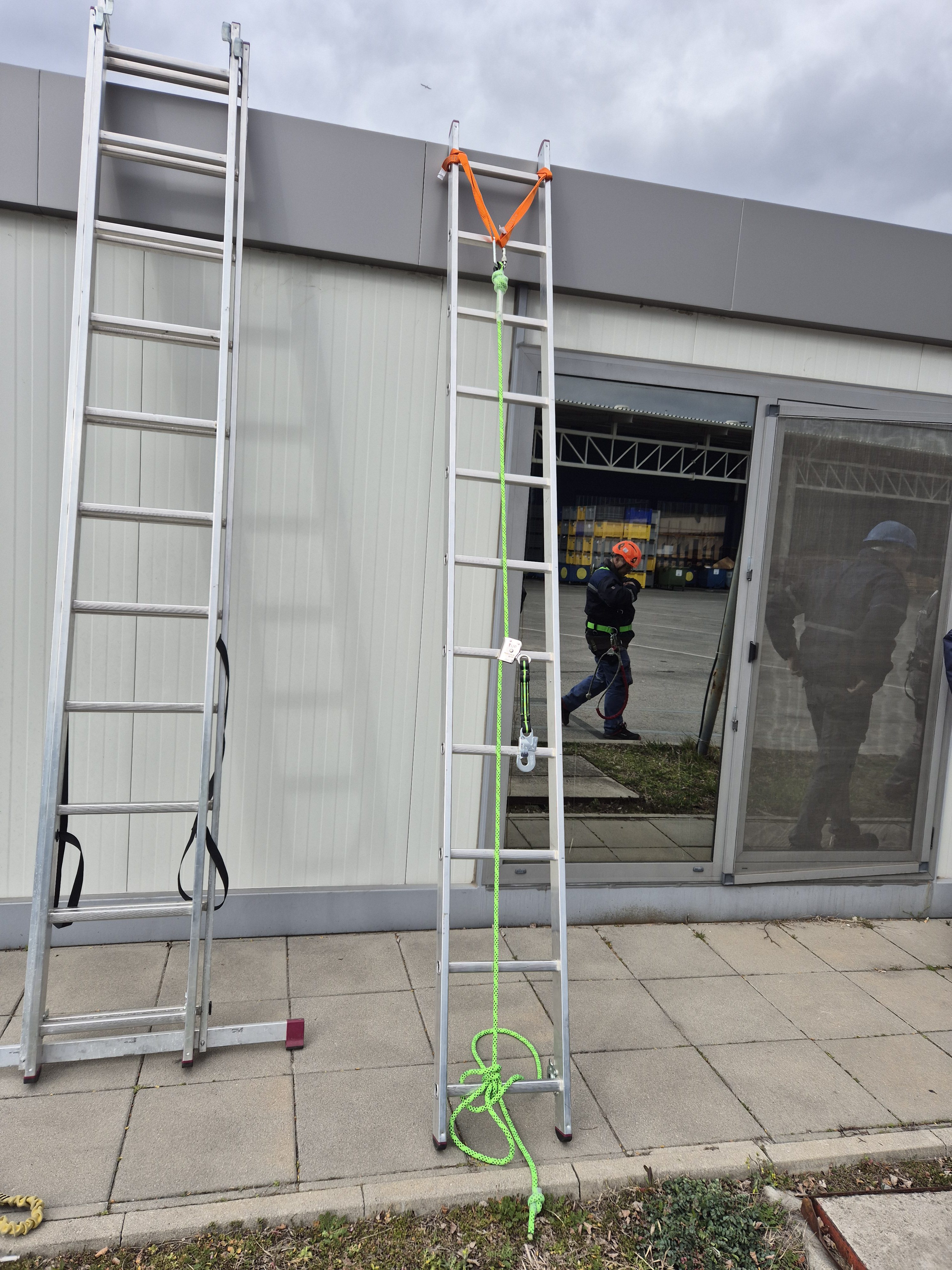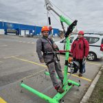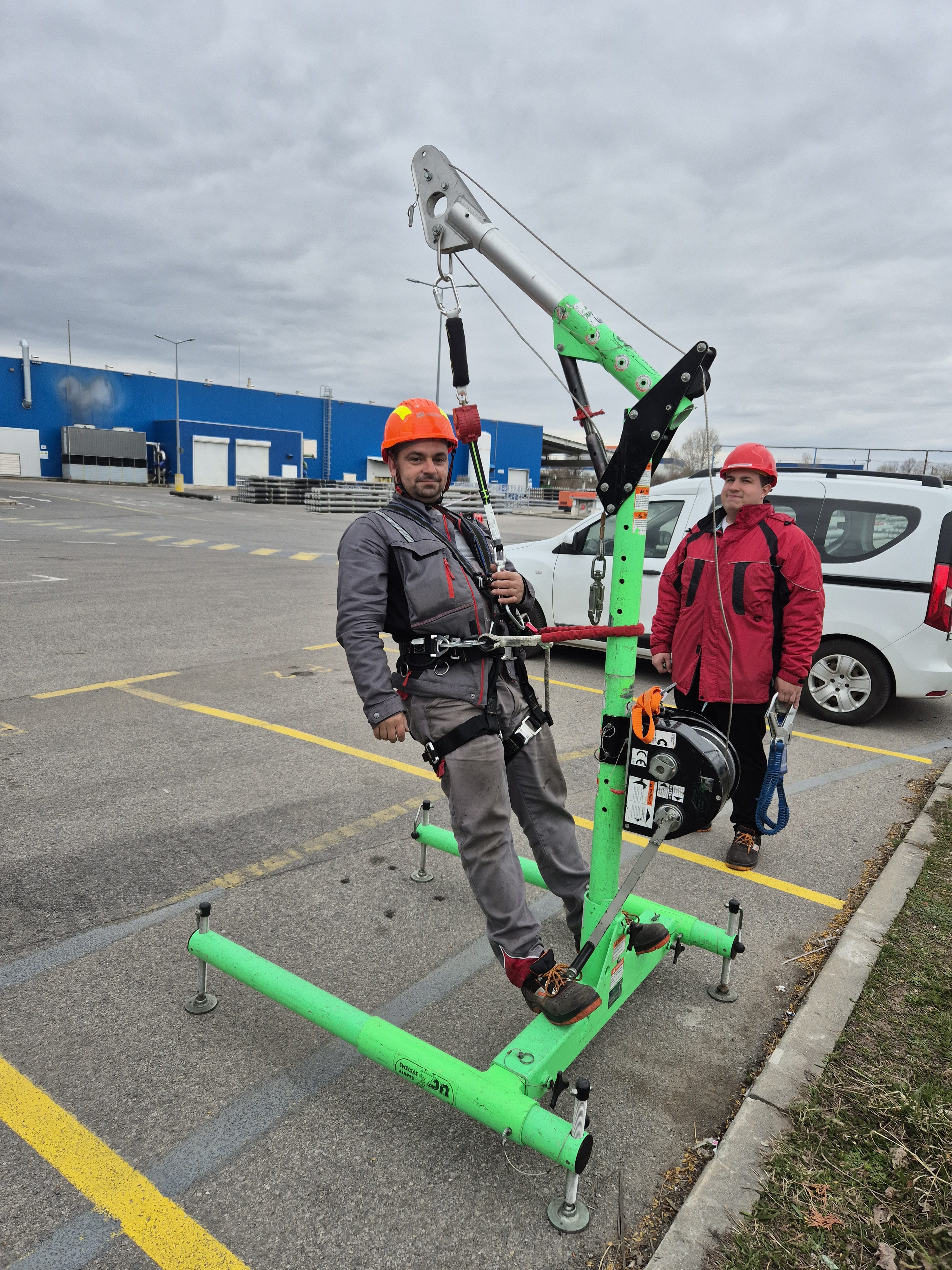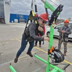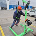 Курсистите успяха да тестват какво реално означава да висят в раменно бедрен колан сбруя. Бяха демонстрирани и онагледени различни техники за правилно обезопасяване при работа с повдигателни платформи, преносими стълби и други.
